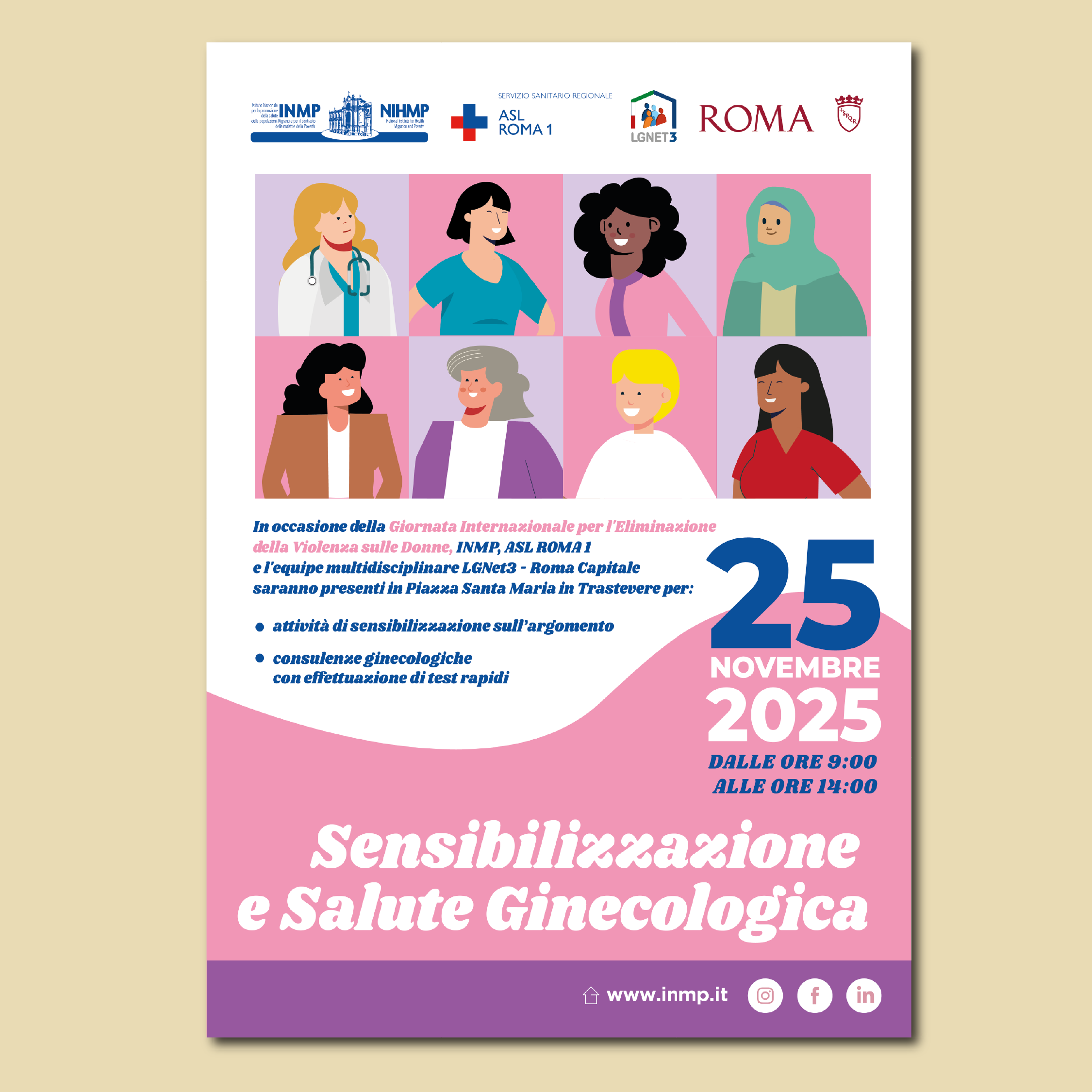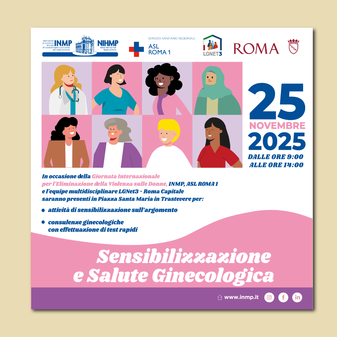 il 25 novembre 2025 in occasione della Giornata Internazionale per l’eliminazione della violenza sulle donne, INMP, ASL ROMA 1 e l’equipe multidisciplinare LGNet3 Rpma Capitale saranno presenti in Piazza Santa Maria in Trastevere per: attivtà di sensibilizzazione sull’argomento e consulenze ginecologiche con effettuazione di testi rapidi