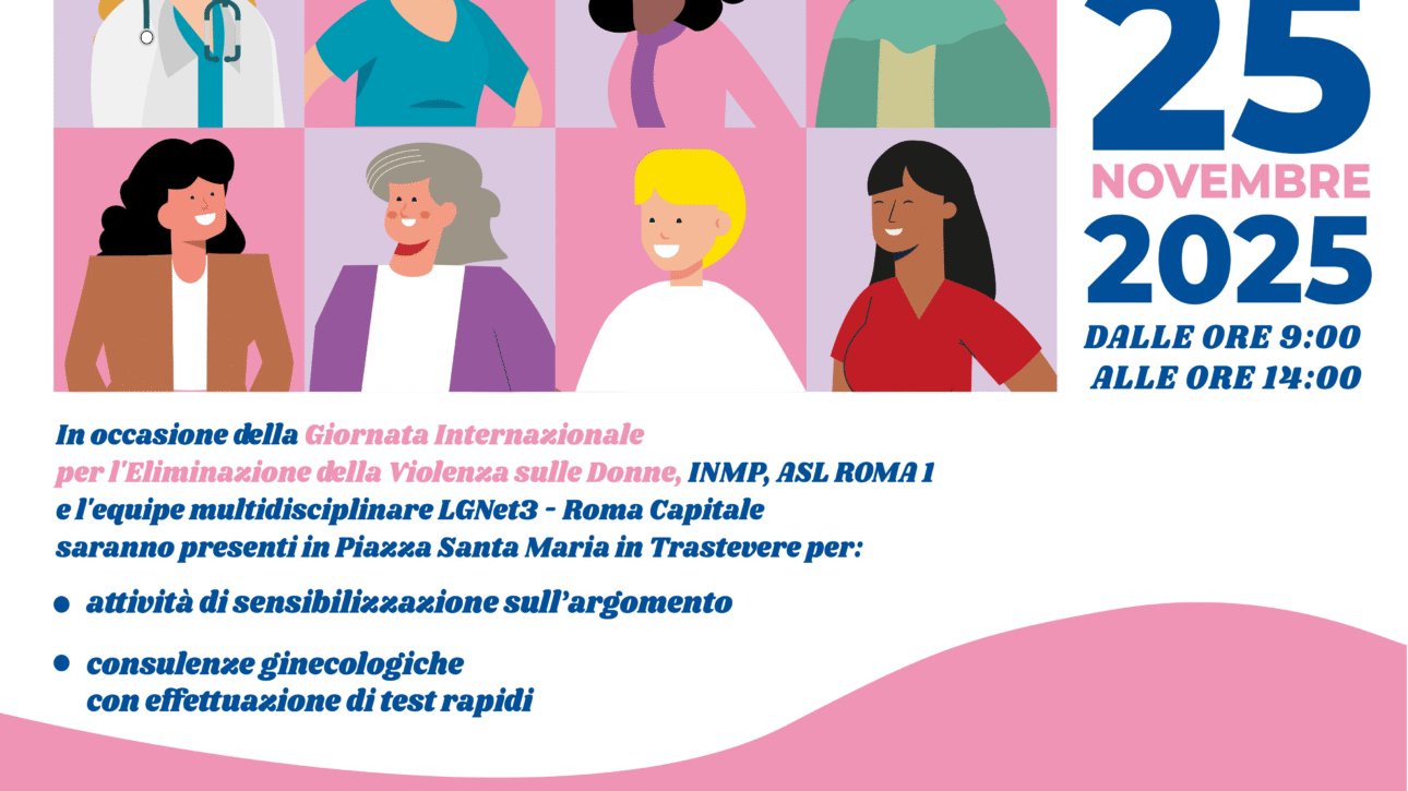 il 25 novembre 2025 in occasione della Giornata Internazionale per l'eliminazione della violenza sulle donne, INMP, ASL ROMA 1 e l'equipe multidisciplinare LGNet3 Rpma Capitale saranno presenti in Piazza Santa Maria in Trastevere per: attivtà di sensibilizzazione sull'argomento e consulenze ginecologiche con effettuazione di testi rapidi